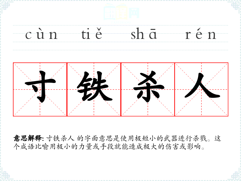 寸铁杀人 的字面意思是使用极短小的武器进行杀戮。这个成语比喻用极小的力量或手段就能造成极大的伤害或影响。