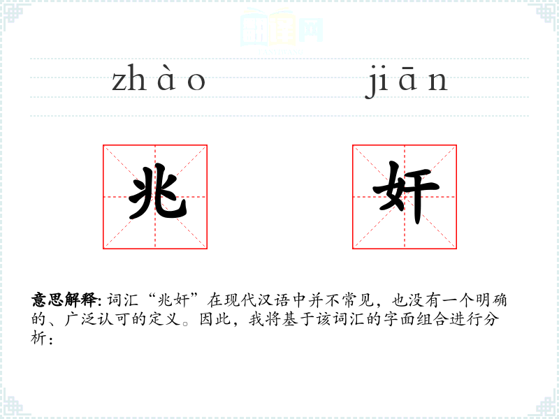 “兆”通常指极大的数目,如“兆头”、“兆亿”,而“奸”则指邪恶、不正直的行为或人。将两者结合,“兆奸”可能被理解为指代极其邪恶或不正直的行为或人物。