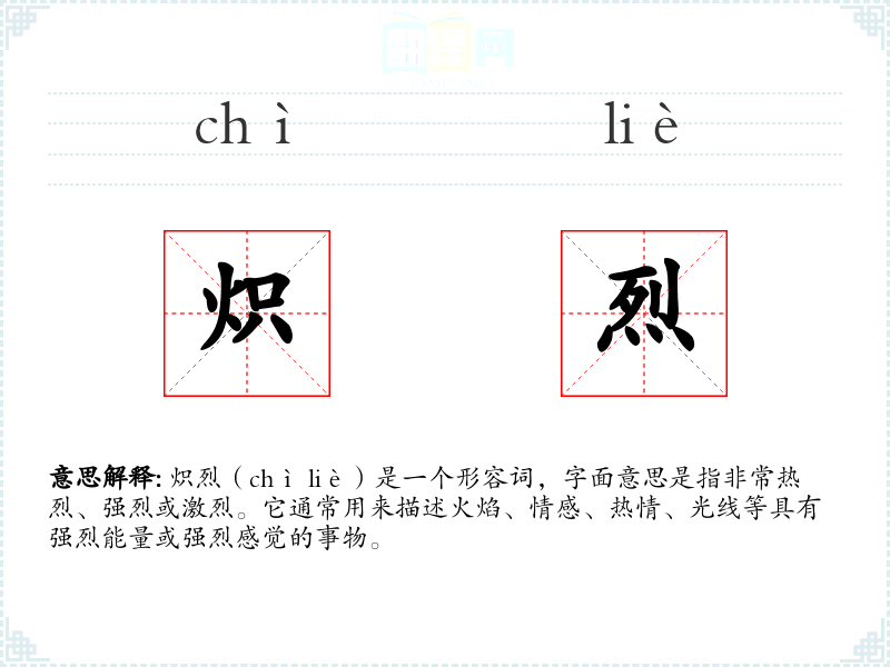 炽烈(chì liè)是一个形容词,字面意思是指非常热烈、强烈或激烈。它通常用来描述火焰、情感、热情、光线等具有强烈能量或强烈感觉的事物。