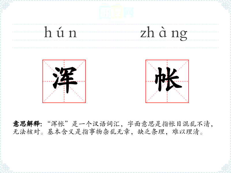 “浑帐”是一个汉语词汇,字面意思是指帐目混乱不清,无法核对。基本含义是指事物杂乱无章,缺乏条理,难以理清。