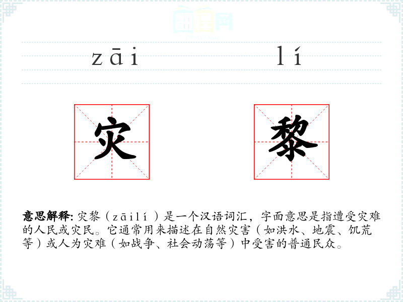 灾黎(zāi lí)是一个汉语词汇,字面意思是指遭受灾难的人民或灾民。它通常用来描述在自然灾害(如洪水、地震、饥荒等)或人为灾难(如战争、社会动荡等)中受害的普通民众。