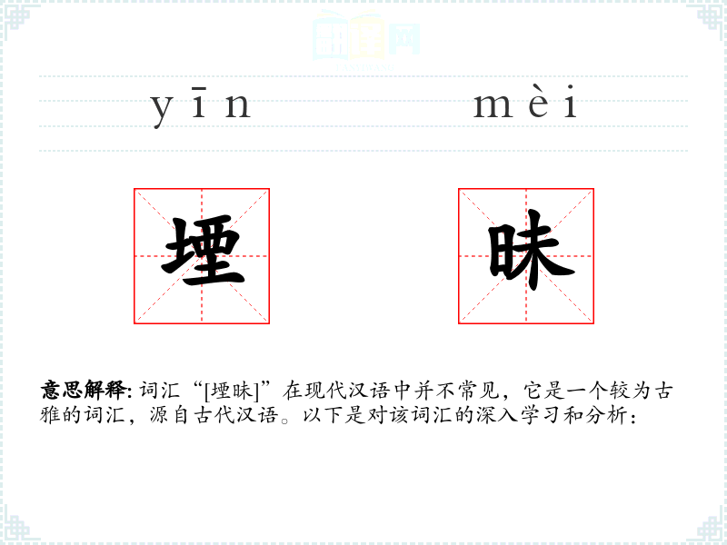 词汇“[堙昧]”在现代汉语中并不常见,它是一个较为古雅的词汇,源自古代汉语。以下是对该词汇的深入学*和分析: