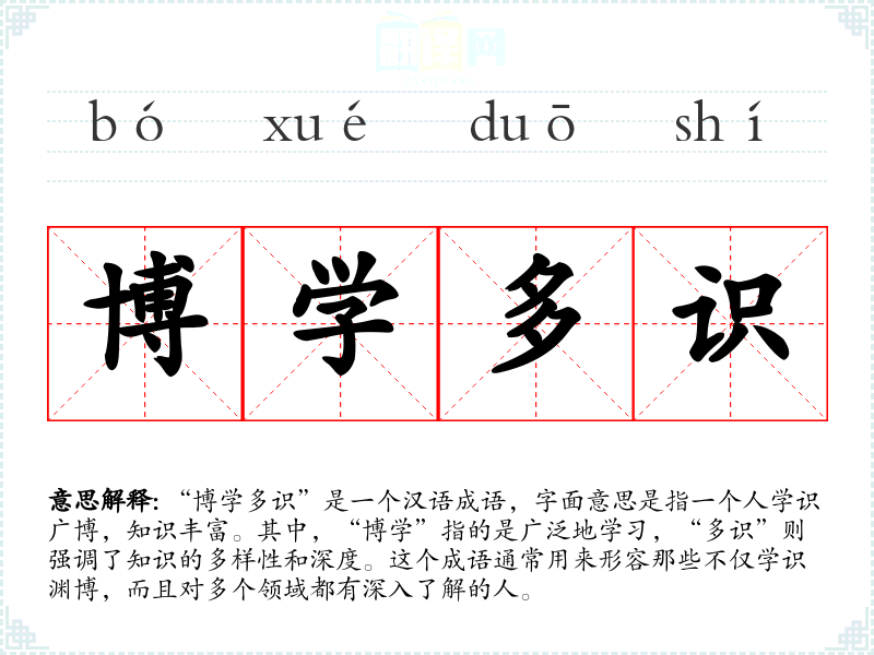 在英语中,类似的表达可能是“well-read”或“knowledgeable”,但这些词汇更多强调的是阅读的广泛性和知识的掌握,而不像“博学多识”那样强调知识的深度和多样性。