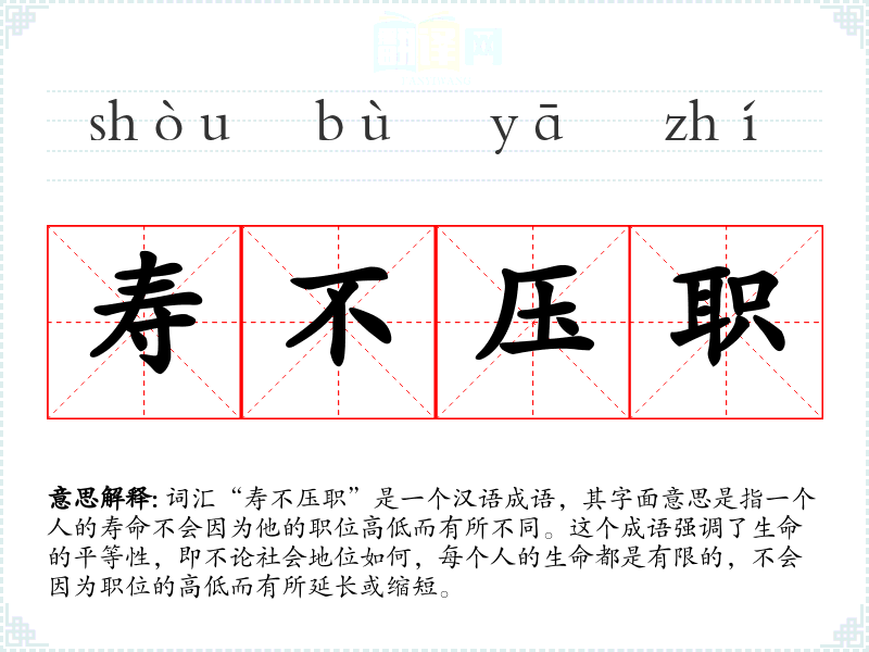 词汇“寿不压职”是一个汉语成语,其字面意思是指一个人的寿命不会因为他的职位高低而有所不同。这个成语强调了生命的平等性,即不论社会地位如何,每个人的生命都是有限的,不会因为职位的高低而有所延长或缩短。