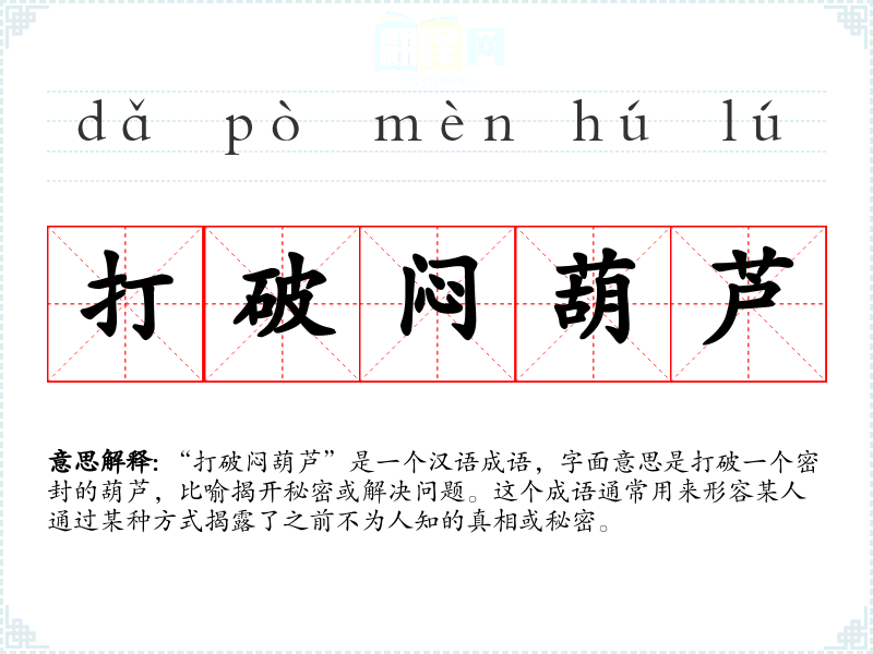 “打破闷葫芦”是一个汉语成语,字面意思是打破一个密封的葫芦,比喻揭开秘密或解决问题。这个成语通常用来形容某人通过某种方式揭露了之前不为人知的真相或秘密。