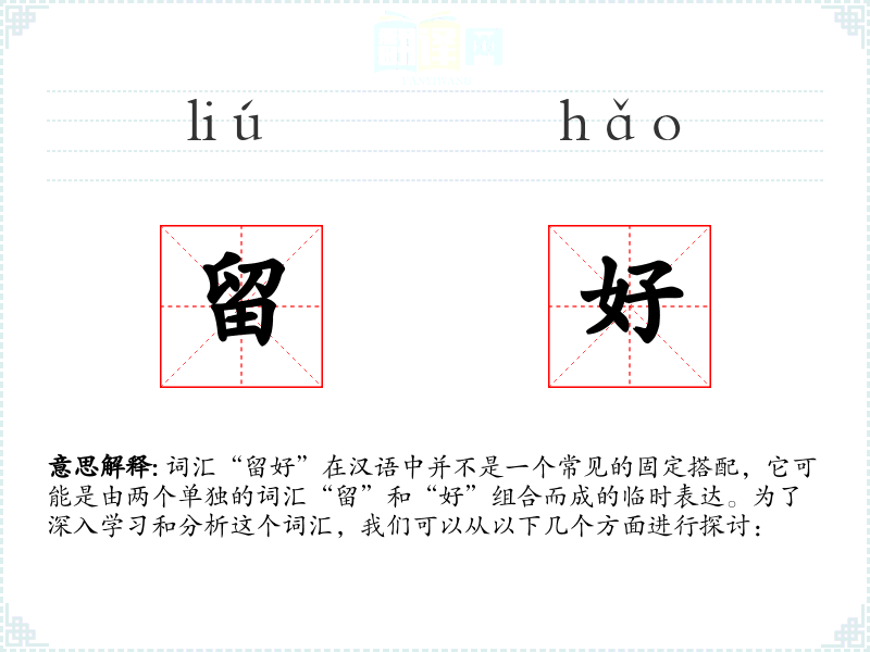 词汇“留好”在汉语中并不是一个常见的固定搭配,它可能是由两个单独的词汇“留”和“好”组合而成的临时表达。为了深入学习和分析这个词汇,我们可以从以下几个方面进行探讨: