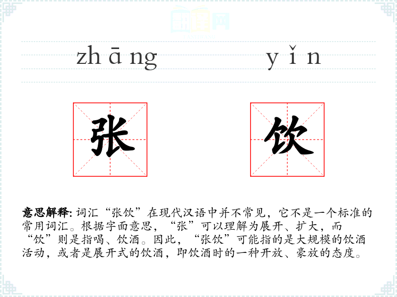 在古代**,饮酒是一种重要的社交活动,“张饮”可能与宴会、庆典等社交场合相关。在现代社会,这种词汇的使用已经非常有限。