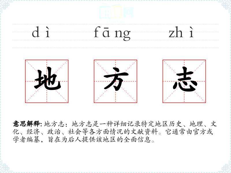 - 对应词汇:在英语中,地方志可以对应为“local chronicles”或“regional annals”。