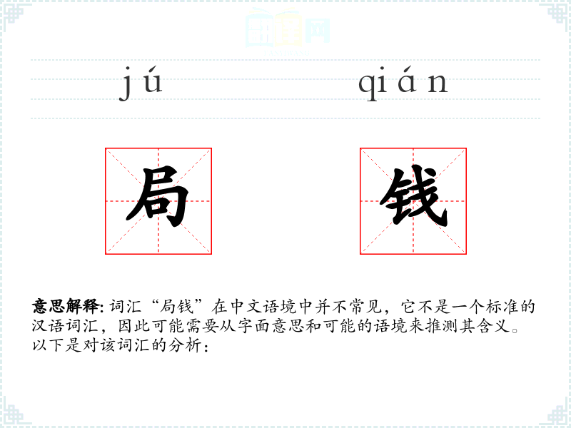 词汇“局钱”在中文语境中并不常见,它不是一个标准的汉语词汇,因此可能需要从字面意思和可能的语境来推测其含义。以下是对该词汇的分析: