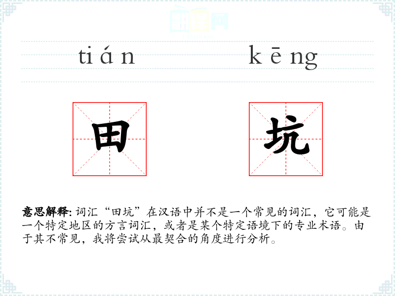 “田坑”字面意思可能是指田地中的坑洼,或者是田间的一种小型水坑。在不同的语境下,它可能有不同的含义。