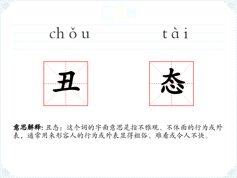 丑态:这个词的字面意思是指不雅观、不体面的行为或外表,通常用来形容人的行为或外表显得粗俗、难看或令人不快。