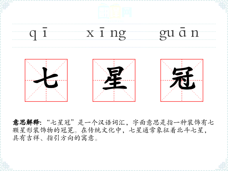 “七星冠”是一个汉语词汇,字面意思是指一种装饰有七颗星形装饰物的冠冕。在传统文化中,七星通常象征着北斗七星,具有吉祥、指引方向的寓意。