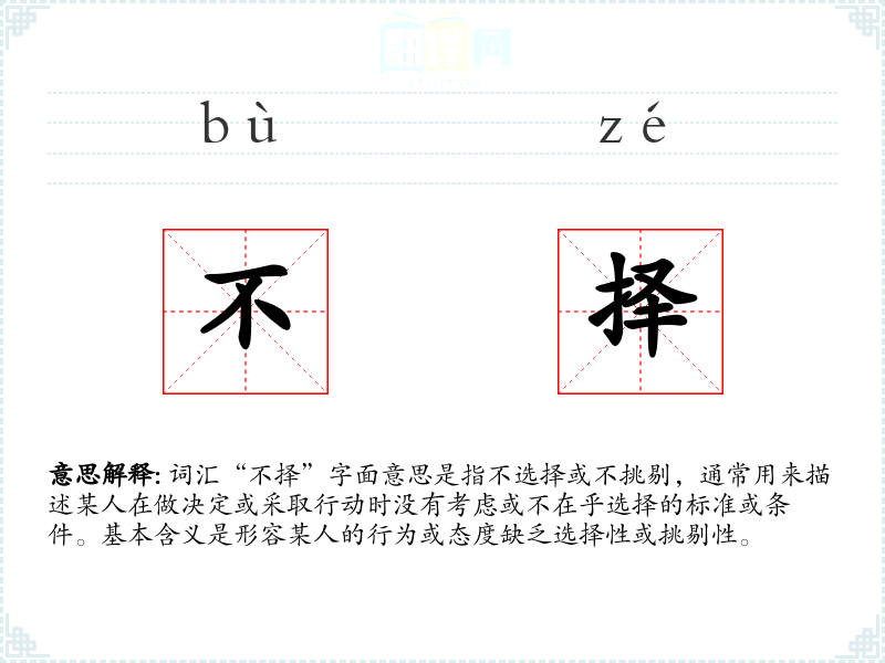 “不择”一词源于古代汉语,其中“不”表示否定,“择”表示选择。随着时间的推移,这个词的使用范围和含义有所扩展,特别是在描述人的行为和态度时。