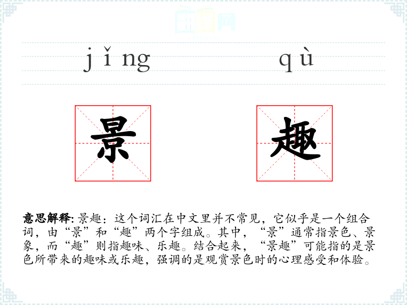 景趣:这个词汇在中文里并不常见,它似乎是一个组合词,由“景”和“趣”两个字组成。其中,“景”通常指景色、景象,而“趣”则指趣味、乐趣。结合起来,“景趣”可能指的是景色所带来的趣味或乐趣,强调的是观赏景色时的心理感受和体验。