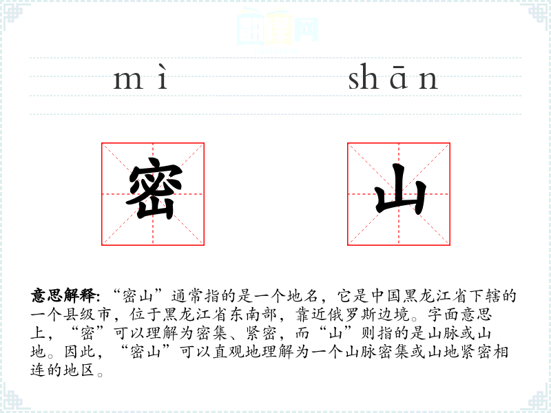 “密山”作为一个地名,其词源可能与当地的地理特征有关。在历史演变中,随着人们对这片土地的认识加深,“密山”的含义也可能随之丰富和变化。