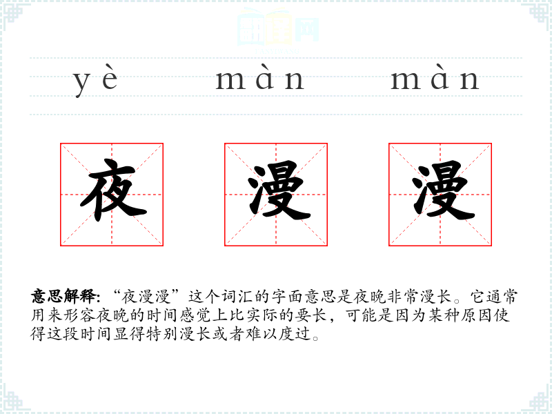 “夜漫漫”这个词汇的字面意思是夜晚非常漫长。它通常用来形容夜晚的时间感觉上比实际的要长,可能是因为某种原因使得这段时间显得特别漫长或者难以度过。