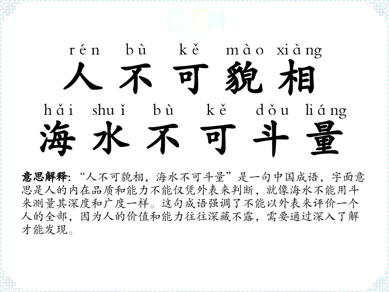 “人不可貌相,海水不可斗量”是一句**成语,字面意思是人的内在品质和能力不能仅凭外表来判断,就像海水不能用斗来测量其深度和广度一样。这句成语强调了不能以外表来评价一个人的全部,因为人的价值和能力往往深藏不露,需要通过深入了解才能发现。