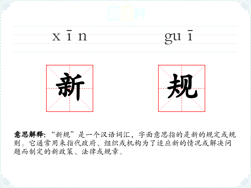 “新规”这个词由“新”和“规”两个字组成。在汉语中,“新”表示新的、最近的意思,“规”则指规则、规定。这个词在古代文献中已有使用,但随着社会的发展,其含义和使用范围也在不断扩展。
