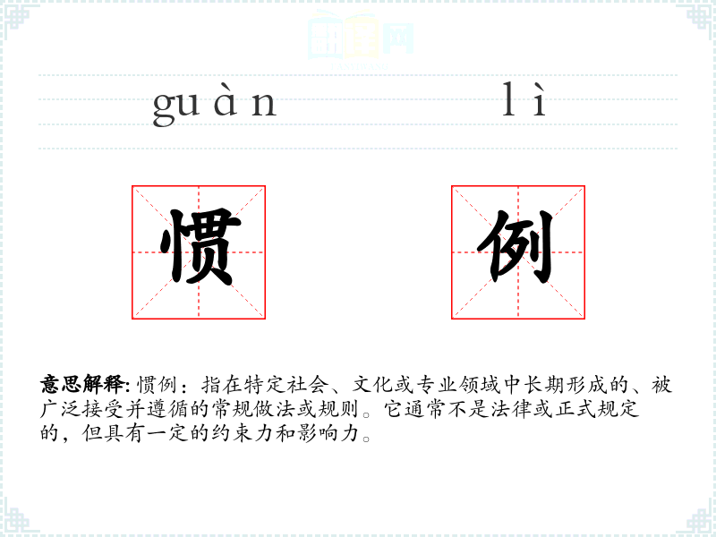 惯例:指在特定社会、文化或专业领域中长期形成的、被广泛接受并遵循的常规做法或规则。它通常不是法律或正式规定的,但具有一定的约束力和影响力。