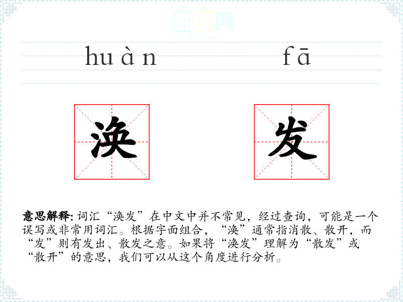 词汇“涣发”在中文中并不常见,经过查询,可能是一个误写或非常用词汇。根据字面组合,“涣”通常指消散、散开,而“发”则有发出、散发之意。如果将“涣发”理解为“散发”或“散开”的意思,我们可以从这个角度进行分析。