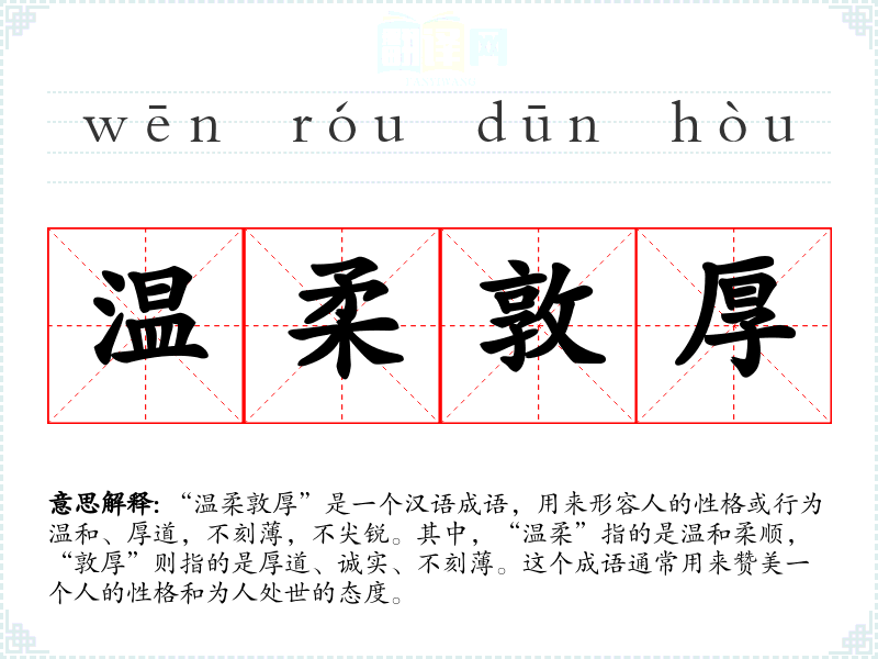“温柔敦厚”是一个汉语成语,用来形容人的性格或行为温和、厚道,不刻,不尖锐。其中,“温柔”指的是温和柔顺,“敦厚”则指的是厚道、诚实、不刻。这个成语通常用来赞美一个人的性格和为人处世的态度。