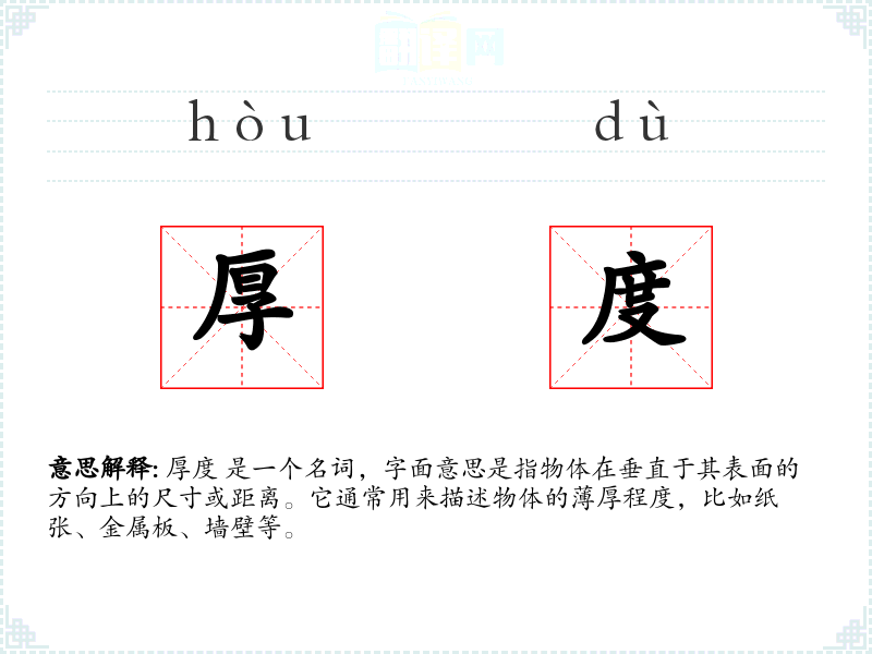 “厚度”一词源于古汉语,由“厚”和“度”两个字组成。在古代,“厚”指的是物体的厚实,而“度”则表示度量。随着时间的推移,“厚度”逐渐成为描述物体尺寸的常用词汇。