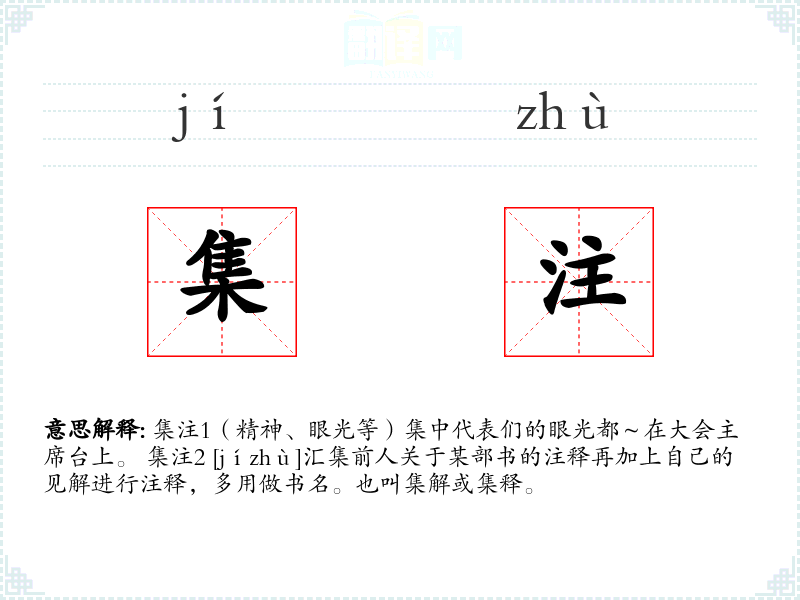 集注1(精神、眼光等)集中代表们的眼光都~在大会主席台上。 集注2 [jízhù]汇集前人关于某部书的注释再加上自己的见解进行注释,多用做书名。也叫集解或集释。