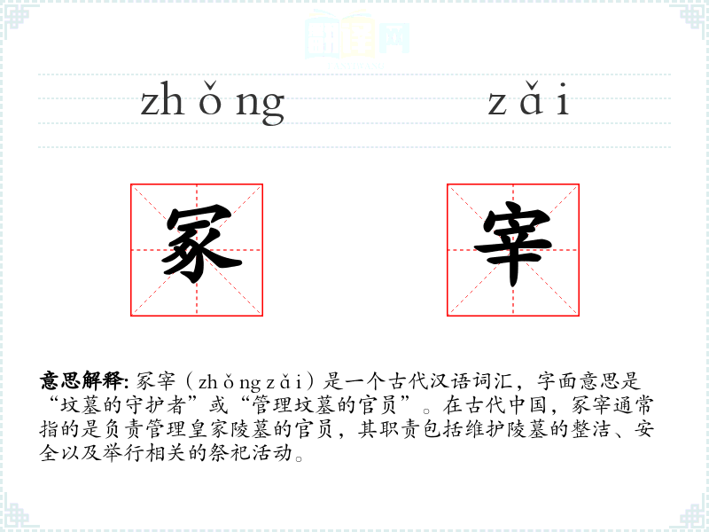 冢宰(zhǒng zǎi)是一个古代汉语词汇,字面意思是“坟墓的守护者”或“管理坟墓的官员”。在古代**,冢宰通常指的是负责管理皇家陵墓的官员,其职责包括维护陵墓的整洁、安全以及举行相关的祭祀活动。