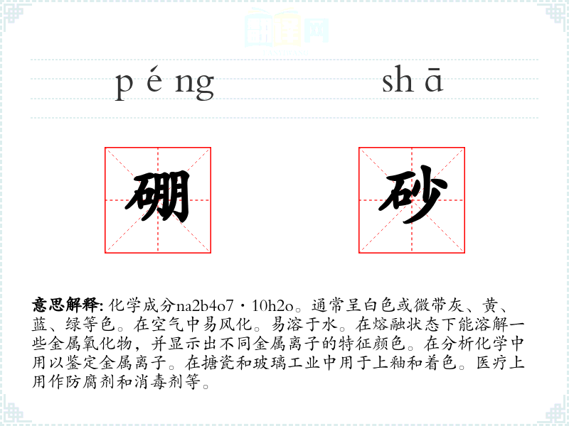 1.化学成分na2b4o7·10h2o。通常呈白色或微带灰、黄、蓝、绿等色。在空气中易风化。易溶于水。在熔融状态下能溶解一些金属氧化物,并显示出不同金属离子的特征颜色。在分析化学中用以鉴定金属离子。在搪瓷和玻璃工业中用于上釉和着色。医疗上用作防腐剂和消毒剂等。
