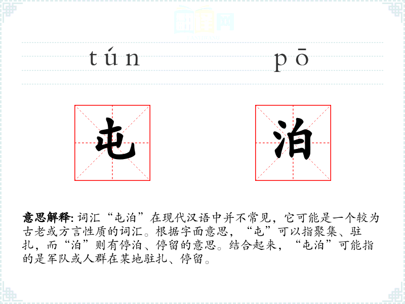 - 理解:“屯泊”是一个具有历史和文化背景的词汇,虽然在现代汉语中不常见,但在研究古代军事和历史时具有重要意义。