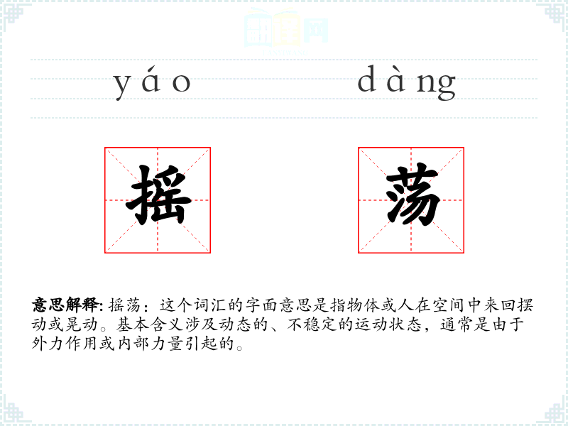 摇荡:这个词汇的字面意思是指物体或人在空间中来回摆动或晃动。基本含义涉及动态的、不稳定的**状态,通常是由于外力作用或内部力量引起的。