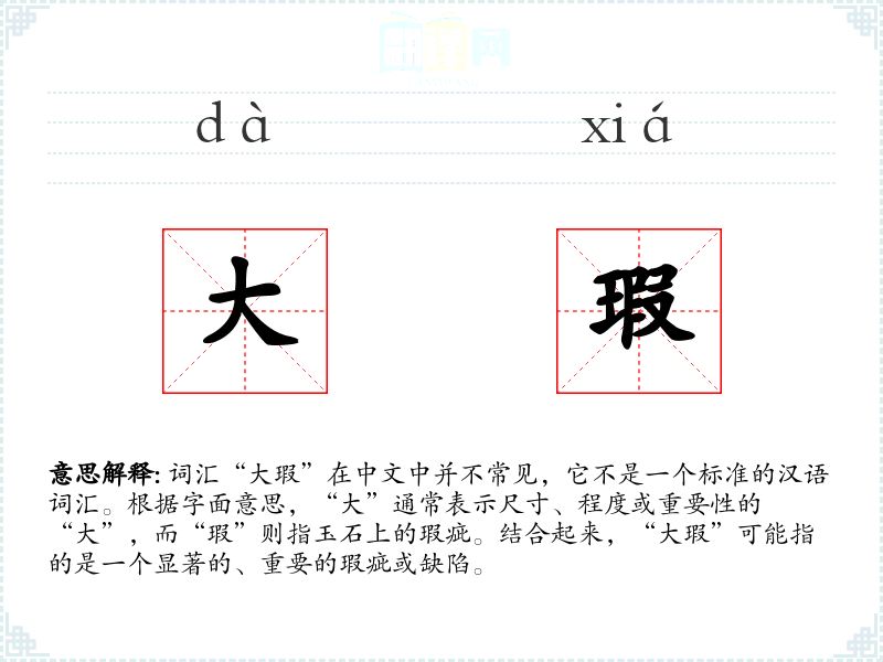 词汇“大瑕”在中文中并不常见,它不是一个标准的汉语词汇。根据字面意思,“大”通常表示尺寸、程度或重要性的“大”,而“瑕”则指玉石上的瑕疵。结合起来,“大瑕”可能指的是一个显著的、重要的瑕疵或缺陷。
