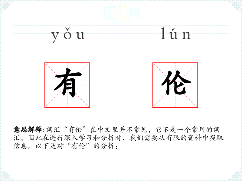词汇“有伦”在中文里并不常见,它不是一个常用的词汇,因此在进行深入学*和分析时,我们需要从有限的资料中提取信息。以下是对“有伦”的分析: