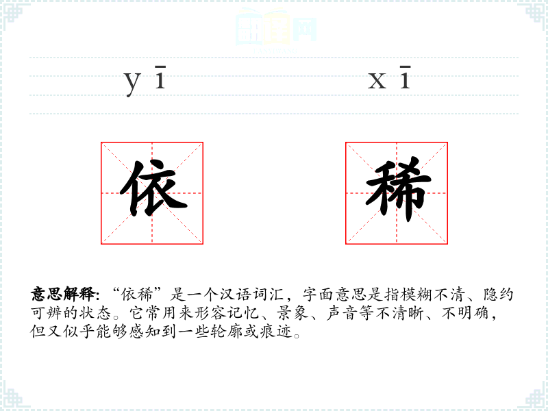 - 口语:在日常口语中,人们可能会用“依稀”来形容记忆模糊或视力不佳时看到的事物。