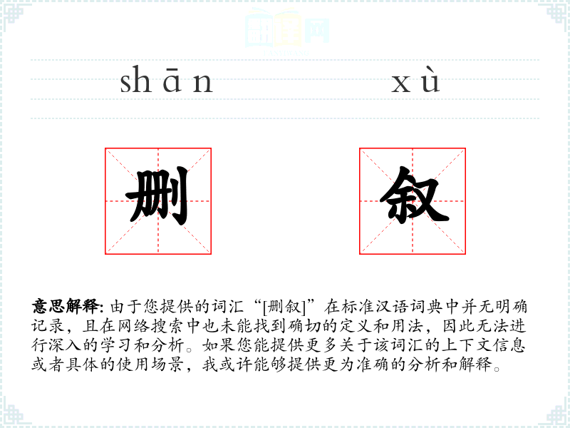 由于您提供的词汇“[删叙]”在标准汉语词典中并无明确记录,且在网络搜索中也未能找到确切的定义和用法,因此无法进行深入的学*和分析。如果您能提供更多关于该词汇的上下文信息或者具体的使用场景,我或许能够提供更为准确的分析和解释。