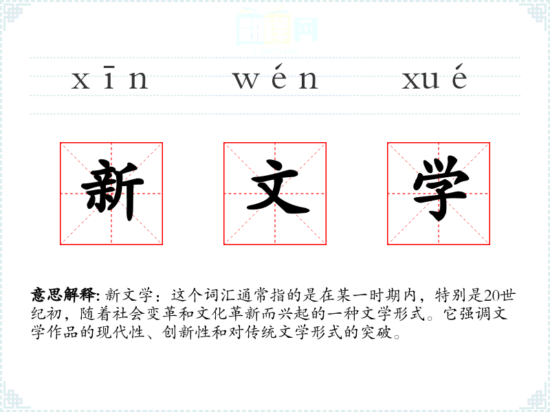 “新文学”这个词汇对我来说,不仅代表了文学的创新和现代性,也象征着对传统束缚的突破和对新表达方式的探索。在语言学*和表达中,理解和运用这个词汇,可以帮助我更好地把握文学作品的现代性和创新性。