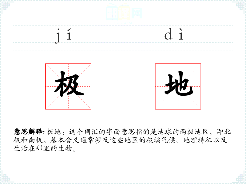 极地:这个词汇的字面意思指的是地球的两极地区,即北极和南极。基本含义通常涉及这些地区的极端气候、地理特征以及生活在那里的生物。