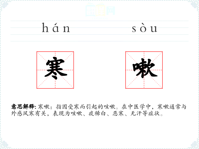 寒嗽:指因受寒而引起的咳嗽。在中医学中,寒嗽通常与外感风寒有关,表现为咳嗽、痰稀白、恶寒、无汗等症状。