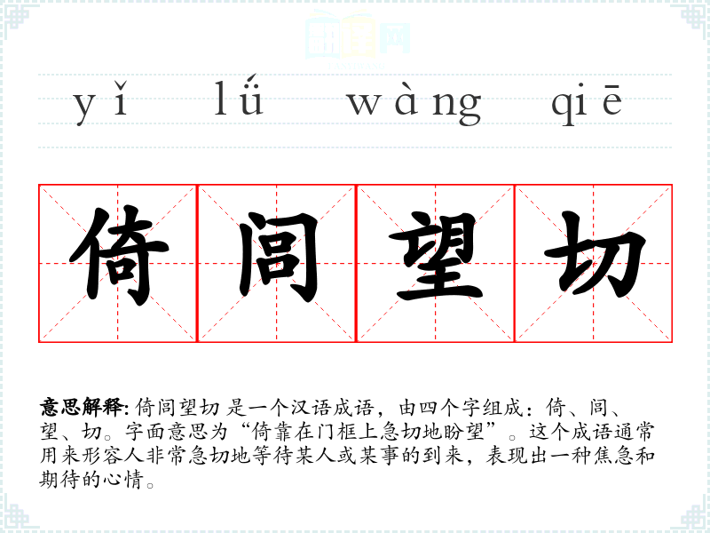倚闾望切 是一个汉语成语,由四个字组成:倚、闾、望、切。字面意思为“倚靠在门框上急切地盼望”。这个成语通常用来形容人非常急切地等待某人或某事的到来,表现出一种焦急和期待的心情。