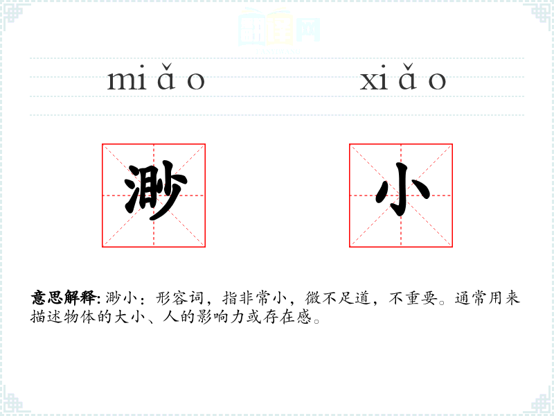 渺小:形容词,指非常小,微不足道,不重要。通常用来描述物体的大小、人的影响力或存在感。