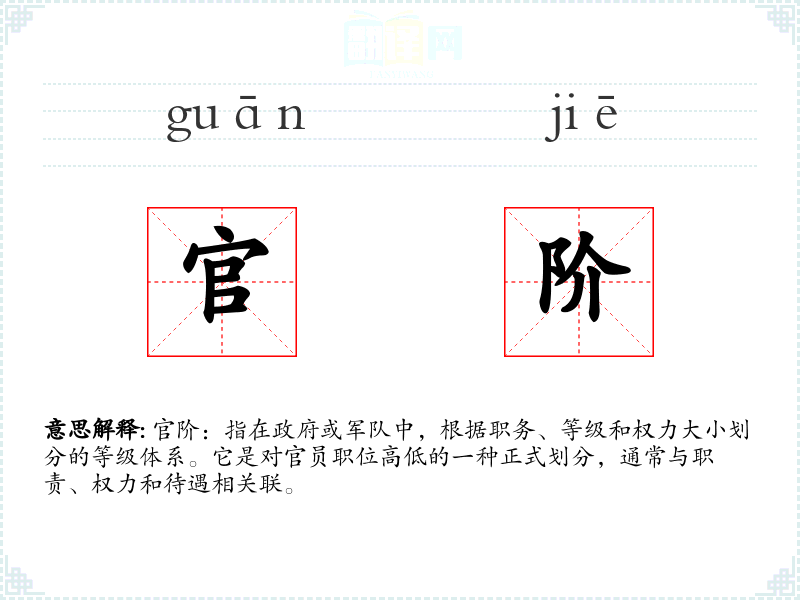 官阶是一个复杂且多维的词汇,它不仅反映了社会结构和权力分配,还承载着文化、历史和个人情感。在学*语言和表达时,理解和运用官阶这一概念,有助于更深入地把握社会动态和个人身份的构建。