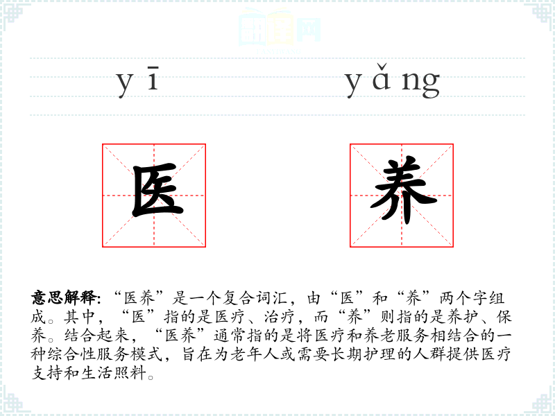 “医养”作为一个现代复合词,其词源较为简单,主要是由“医”和“养”两个常用汉字组合而成。随着社会对老年护理需求的增加,这个词在近年来逐渐被广泛使用。