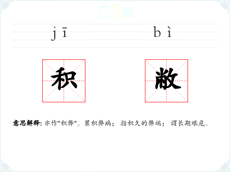 亦作"积弊"。累积弊病; 指积久的弊端; 谓长期艰危。