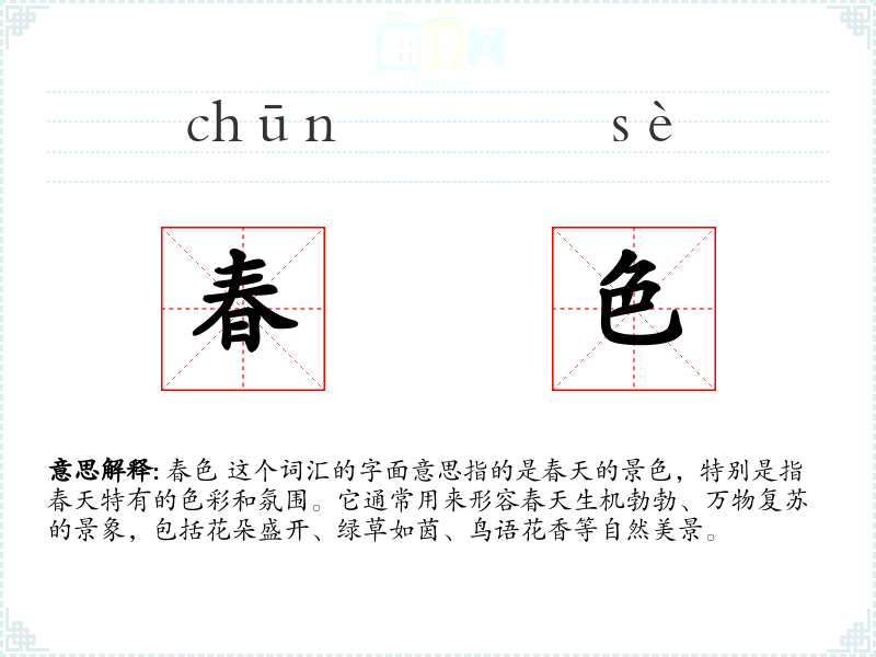 - 反义词:秋色、冬景(这些词汇分别代表秋天和冬天的景色,与春色形成对比)