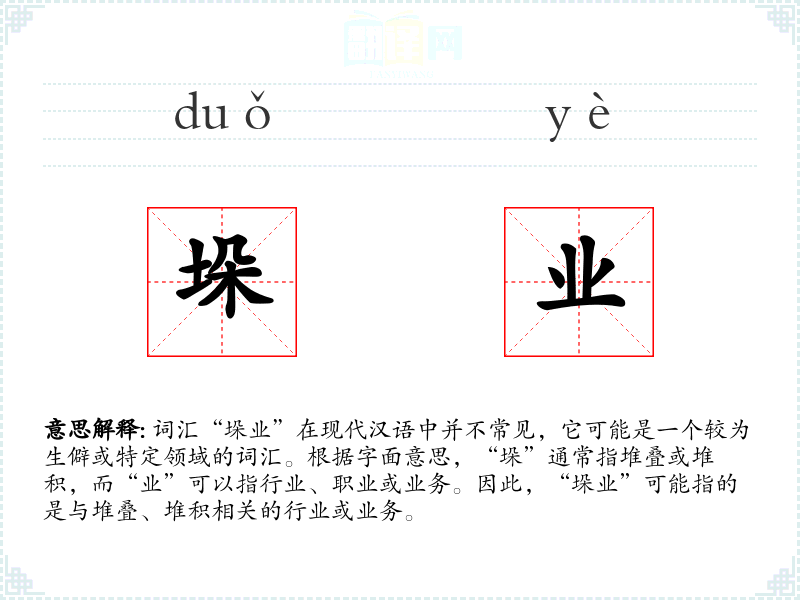 词汇“垛业”在现代汉语中并不常见,它可能是一个较为生僻或特定领域的词汇。根据字面意思,“垛”通常指堆叠或堆积,而“业”可以指行业、职业或业务。因此,“垛业”可能指的是与堆叠、堆积相关的行业或业务。