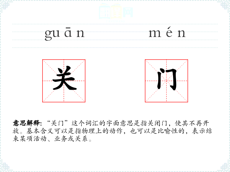 “关门”这个词汇的字面意思是指关闭门,使其不再开放。基本含义可以是指物理上的动作,也可以是比喻性的,表示结束某项活动、业务或关系。