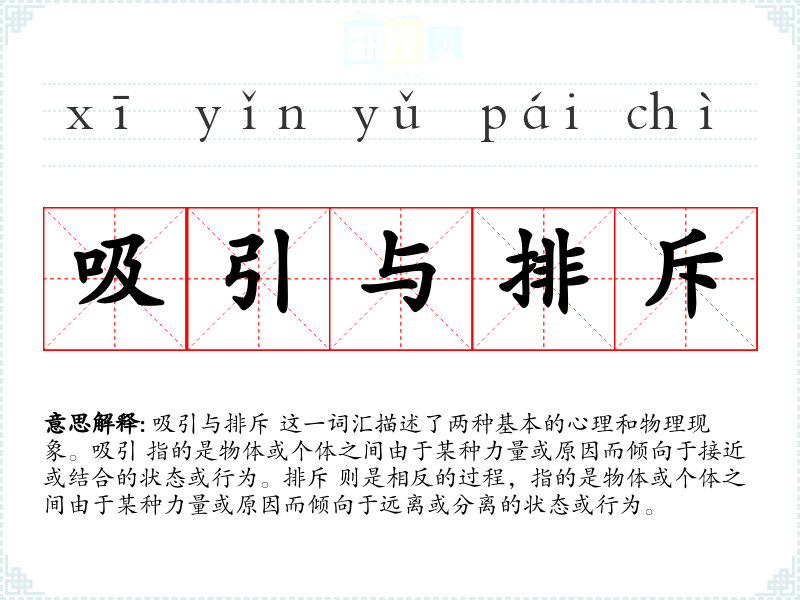 在不同的语言和文化中,“吸引与排斥”的概念有着相似的表达。例如,在汉语中,“吸引”可以翻译为“吸引”,“排斥”可以翻译为“排斥”。尽管具体的词汇可能有所不同,但基本的概念是普遍存在的。