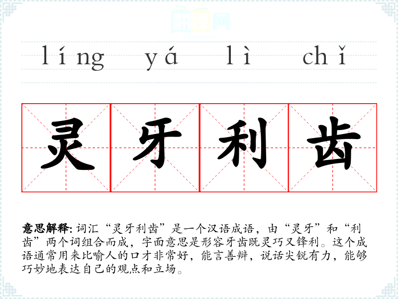 词汇“灵牙利齿”是一个汉语成语,由“灵牙”和“利齿”两个词组合而成,字面意思是形容牙齿既灵巧又锋利。这个成语通常用来比喻人的口才非常好,能言善辩,说话尖锐有力,能够巧妙地表达自己的观点和立场。