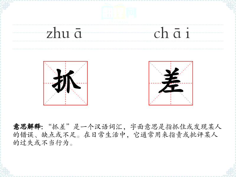 “抓差”是一个汉语词汇,字面意思是指抓住或发现某人的错误、缺点或不足。在日常生活中,它通常用来指责或批评某人的过失或不当行为。