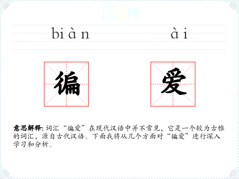 词汇“徧爱”在现代汉语中并不常见,它是一个较为古雅的词汇,源自古代汉语。下面我将从几个方面对“徧爱”进行深入学*和分析。